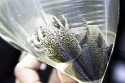 The most representative animal found in these waters is the axolotl (Ambystoma mexicanum). This amphibian was used as a medicine, food and ceremonial object during the Aztec Empire. It was considered to be an incarnation of the god Xolotl, brother of Quetzalcoatl. It has been studied due to its abilities to regenerate limbs and other body parts. It can also reach sexual maturity as a larva, which no other amphibian can do. While mostly aquatic, it does have limited ability to breathe air.[24] As of 2003, there were only 600 axolotls known to exist in the wild.[23] Most of the threat to the species is loss of habitat and pollution, but the introduction of non-native fish such as tilapia has also had disastrous effects on the population of this and other species.[23] Conservation efforts include research and environmental education.[24] The Grupo de Investigación del Ajolote en Xochimilco (GIA-X) is a nonprofit research group dedicated to the preservation of the axolotl, which is in danger of extinction. It works to better understand the creature as well as with the local community to protect what is left of its habitat.[25]