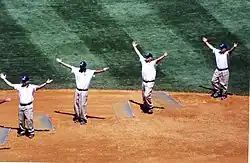 Following the sixth inning of New York Yankees baseball games at Yankee Stadium, the grounds crew traditionally grooms the infield while leading the crowd in the dance.[35] The Bleacher Creatures used to sing "why are you gay?" to the tune when it was played but agreed in 2010 to stop doing it.[36]