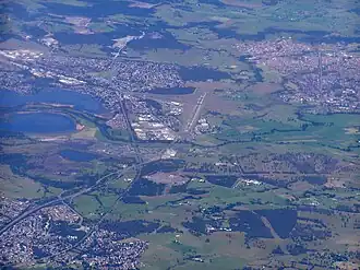 An aerial view of the area looking south, with Yallah, bottom left; Albion Park Rail, top left; Albion Park, top right; and Lake Illawarra, centre-left. | |||||||||||||||