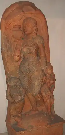 Yamuna's iconographic depiction is seen on temple doorjambs, paired with that of Ganga (the goddess of the Ganges), since the Gupta era.[1] The Agni Purana describes Yamuna as black in complexion, standing on her mount, the tortoise, and holding a water pot in her hand.[3] In an ancient painting she is shown as a beautiful maiden standing on the banks of the river.[1]