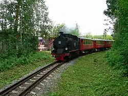 The narrow-gauge route 750 millimetres (30 in) has four stations.[1] The length is 2.8 kilometres (1.7 mi) and a round trip lasts 27 min. Although the train stops at all stations, passengers are only checked in at the final stations. The remaining stops are in the forest, and are rarely visited.