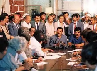 Since 2011, Yemen has been enduring a political crisis, marked by street protests against poverty, unemployment, corruption, and President Saleh's plan to amend Yemen's constitution and eliminate the presidential term limit.[22] By 2015, the country became engulfed by an ongoing civil war with multiple entities vying for governance, including the Presidential Leadership Council of the internationally recognized government, and the Houthi movement's Supreme Political Council. This conflict, which has escalated to involve various foreign powers, has led to a severe humanitarian crisis.[23][24][25][26][27][28]