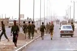 ![]() Clockwise from top: Northern Yemeni soldiers next to an abandoned bus with Ali Abdullah Saleh's portrait; Southern separatist soldiers taking cover behind a T-55 tank; Northern forces fighting in Aden city; Northern forces' BM-21 Grad multiple rocket launcher shelling separatist positions; Northern soldiers in a technical. | |||||||