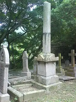 In 1900, Yeung started another uprising in Huizhou, Guangdong, but this also failed. He returned to Hong Kong and taught English in a school at Gage Street to support his family. On 10 January 1901, around 6 pm, Yeung was shot in the head and chest (while tutoring students on the second floor of his home with his young child seated on his lap)[8] by Chen Lin (陳林), an assassin sent by the Qing government. He died from his wounds the following day and was buried in the Hong Kong Cemetery in Happy Valley. His tomb was completed on 23 December 1901.