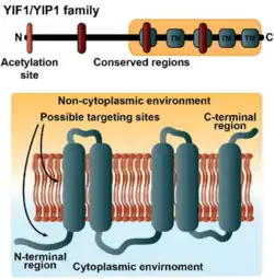 1. ^ a b c d e f Shaik S, Pandey H, Thirumalasetti SK, Nakamura N (2019). "Characteristics and Functions of the Yip1 Domain Family (YIPF), Multi-Span Transmembrane Proteins Mainly Localized to the Golgi Apparatus". Front Cell Dev Biol. 7: 130. doi:10.3389/fcell.2019.00130. PMC 6682643. PMID 31417902.