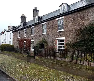 The architectural historian John Newman describes New Market Street as; "the most attractive street in the town."[1] The three houses of Ynys Hafod, Henllys and Min Yr Afon stand halfway down the street, on its western side. Of stone construction,[1] they are fronted by cobbles and iron railings which date from the early 19th century.[1] The houses have sash windows which are also 19th century in date. The houses are of earlier origin however, as indicated by the voussoirs around the windows. Newman suggests these indicate an original construction date of the early 17th century.[1] Cadw ventures an earlier date, the 16th century, noting that documentation references the building as being the property of the Rumsey family in 1575.[2] The building was remodelled and divided into three in the early 19th century.[2] The architect Thomas Henry Wyatt may have been involved in the renovations.[2] The Monmouthshire antiquarian Sir Joseph Bradney noted in his A History of Monmouthshire in 1921 that the Welsh names for the houses were of recent origin.[2]