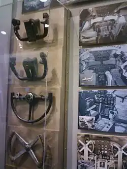 Collection of control yokes at Boeing Future of Flight Museum: 747, 707, B-29, Trimotor. The former two yokes are W-shaped, while the latter two are circular.