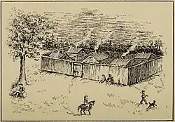 As Rich's designs were sculpted in metal rather than the usual plaster, the design has an unusually flat relief more reminiscent of later (late 20th century onward) designs.[27] The obverse depicts the area of the first European settlement in Maine, with Brown's Garrison, the Saco River and four sentries before the fort, with one of them mounted.[29] This made the York County half dollar the third U.S. coin to depict a horse, after the Lafayette dollar (dated 1900) and the Stone Mountain Memorial half dollar (1925).[30] Beyond the fort is the rising sun, and amid the rays is the word LIBERTY; below the fort is seen the motto E PLURIBUS UNUM. Around the design are seen the name of the issuing nation and the coin's denomination.[29]