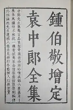 Yuan Hongdao (Chinese: 袁宏道; pinyin: Yuán Hóngdào; Wade–Giles: Yüan Hung-tao, style name Zhonglang, 1568–1610) was a scholar-official and one of the greatest Chinese poets and littérateurs of the Ming Dynasty.[1] He is also a well known author on Pure Land Buddhism.[2]