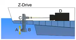 The Z-drive is so named because of the appearance (in cross section) of the mechanical driveshaft or transmission configuration used to connect the mechanically supplied driving energy to the Z-drive azimuth thruster device. This form of power transmission is called a Z-drive because the rotary motion has to make two right angle turns, thus resembling the letter "Z". This name is used to differentiate the arrangement of drive to that of the L-drive. It does not refer to an electric motor in a rotating pod.