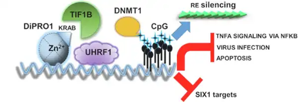 ZNF555/DiPRO1has been shown to interact with TIF1B/KAP1, UHRF1 and MCM protein complex.[7] ZNF555 protein shares certain DNA-binding regions with SIX1, a transcription factor regulating myogenesis, and ZSCAN4, a zinc finger protein implicated in genomic stability.[7]