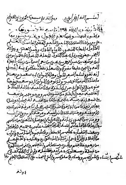 The cataloger of the manuscript made also a mistake in writing the copyist's name incorrectly. Mahmoud Bouayad pointed out that the transcription was erroneous, explaining that the name of the copyist is: al-Ḥabīb ibn Yakhlef ibn Jalloul ibn al-Eid al-Farādi, from the Farādi family in Mascara (actually in western Algeria), a family known for its knowledge and scholarship. This copyist completed the transcription of the manuscript on Friday, 15 Muḥarram 1235 H (February 2, 1819), for a person named Mouslim ibn Abdelkader Khouja, and "for whomever Allah wills after him, as a gift or for sale".[2]
