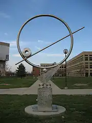 "Zephyr" means "west wind" and is also the name of a pioneer streamlined locomotive, dating to the 1930s. Each of the eight geometric shapes has a meaning. The rectangular base represents the core of education.[1] The two side-by-side cylinders represent the wheels of progress while the triangle represents a mode of transportation designed for speed. The small cylinder that supports the hoop signifies fortitude and determination and the hoop itself stands for the circle of life. The long pole represents ambition and the hollow scroll stands for the scroll of knowledge. The artist dedicated the sculpture to today's youth.[1]