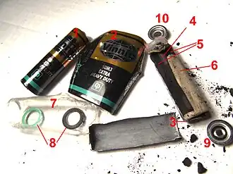 Disassembled zinc chloride cell (similar to zinc carbon cell). 1: entire cell, 2: steel casing, 3: zinc negative electrode, 4: carbon rod, 5: positive electrode (manganese dioxide mixed with carbon powder and electrolyte), 6: paper separator, 7: polyethylene leak proof isolation, 8: sealing rings, 9: negative terminal, 10: positive terminal (originally connected to carbon rod).