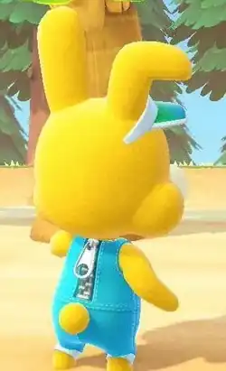 Zipper T. Bunny is a yellow rabbit with wide-open eyes and floppy ears,[1] as well as sporting a visor and blue overalls.[2][3] Zipper is seen as the mascot of Bunny Day, the Animal Crossing series' equivalent to Easter,[4] with Zipper being equated to being the Easter Bunny. Zipper is typically depicted as being in a constant state of happiness, by cheerfully hopping and frequently speaking in rhymes to the player.[5] However, if out of view of the player, Zipper will become exhausted and tired,[1] even expressing displeasure for his job.[5]