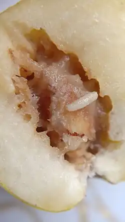 The greatest enemies of the jujube are fruit flies. Some cultivars are much more susceptible than others, the flies preferring the largest, sweetest fruits. 100% of those may be attacked, while on a neighbouring tree bearing a smaller, less-sweet type, only 2% of the crop may be damaged. The larvae pupate in the soil and it has been found that treatment of the ground beneath the tree helps reduce the problem. Control is possible with regular and effective spraying of insecticide.[2]