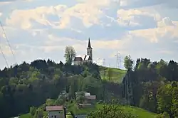 The local church, built on a hill east of the settlement, is dedicated to Saint Rosalia and belongs to the Parish of Šentjur. It dates to the 17th century, with a chapel dedicated to Saint Anthony added to the southern nave in 1746.[8] The church was built as a votive offering in the aftermath of the plague of 1645–1660; it is distinguished by its high-quality architecture and stonework. The main altar dates from 1667, and the three altars in the nave from 1859. The chancel was painted in 1908 by the Celje painter Albin Paradiž (1879–1910). The glass chandelier dates to 1850. The largest of the church's bells was cast in Celje in 1756 by Gašper Schneider (1726–1774); its tone was considered so strikingly gentle that the composer Gustav Ipavec composed the song "Iz stolpa se mi zvon doni" (From the Tower the Bell Tolls to Me) in its honor. Saint Anthony's chapel contains frescoes by the Ljubljana painter Franc Jelovšek (1700–1764), an altar dating from 1864 to 1866 by the Celje wood-carver Ignacij Oblak (1834–1916), and a pulpit from 1870.[9]