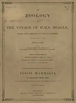 The Zoology of the Voyage of H.M.S. Beagle Under the Command of Captain Fitzroy, R.N., during the Years 1832 to 1836 is a 5-part book published unbound in nineteen numbers as they were ready, between February 1838 and October 1843.[1] It was written by various authors, and edited and superintended by Charles Darwin, publishing expert descriptions of the collections he had made during the Beagle voyage.[2]