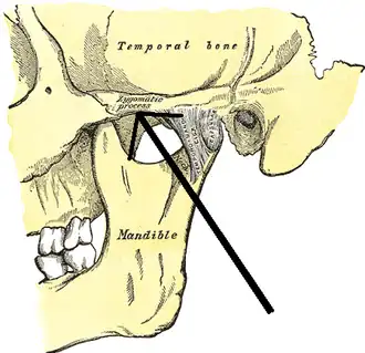 Articulation of the mandible. Lateral aspect (Zygomatic process visible at center)